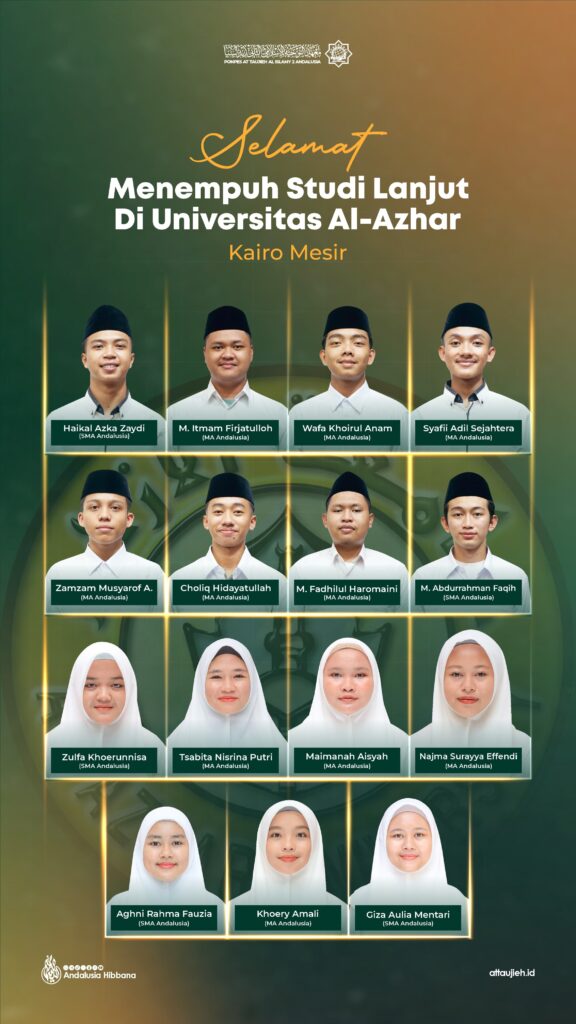 (Kebasen, 16 Desember 2025) – Pondok Pesantren At Taujieh Al Islami 2 Andalusia baru saja menorehkan tinta emas. Sebanyak 15 santri dan santriwati terbaik, termasuk 10 lulusan dari Madrasah Aliyah (MA) Andalusia angkatan pertama, resmi diberangkatkan untuk melanjutkan pendidikan ke Universitas Al-Azhar, Kairo, Mesir.